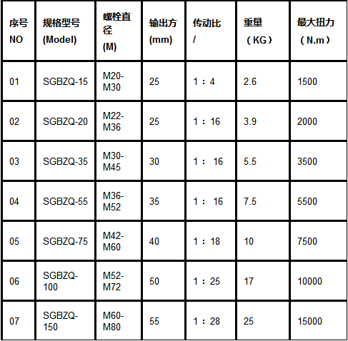 我司生產的這款SGBZQ系列的扭力倍增器是緊固和拆卸大規格螺栓的專用工具,具有力矩放大功能,只需操作人員施加很小的力,即可得到1-28倍的輸出力矩.配套扭力扳手根據傳動比預置好扭力,達到相應的預緊扭矩,能自動發出訊號“嗒”的一聲報警,同時伴有明顯的手感振動,從而輕捷的完成螺栓螺母的緊固拆卸工作。
